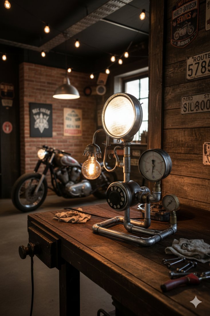 Unikalna, ręcznie wykonana lampa w stylu industrialnym / steampunkowym. Powstała z połączenia starych elementów technicznych: reflektora, manometru, fragmentów instalacji, włącznika ze starego telefonu i ozdobnych detali metalowych. Każdy element został starannie dopasowany, dzięki czemu lampa nie tylko daje światło, ale staje się także oryginalną dekoracją wnętrza. Dwa źrudła światła.