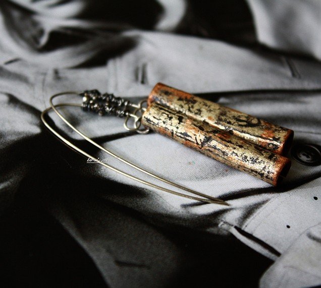 Intrygujące kolczyki wykonane ręcznie , surowy , organiczny , industrialny styl ( nie są identyczne ) wykonane z formowanej miedzi ( belki ) , reszta elementów z oksydowanego przecieranego srebra pr. 925 , belki - wys. ok. - 3,5 cm , szer. ok. - 8 mm pokryte nieregularnie wtopionym srebrem pr. 925 / 999 , następnie polerowane i satynowane ( pięknie odbijają światło ) . Biżuterie wysyłam w ozdobnym bezpiecznym opakowaniu .