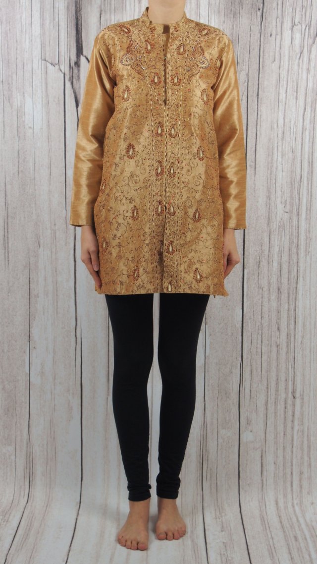 Przepiękna indyjska tunika - pięknie wyszywana, zdobiona koralikami. Informacji o materiale brak. Zazwyczaj jest to jedwab. I może to być ten materiał. Jedna kieszeń. Pod szyją zapinana na guziczki. Ze stójką. Znanej indyjskiej marki Ankit.