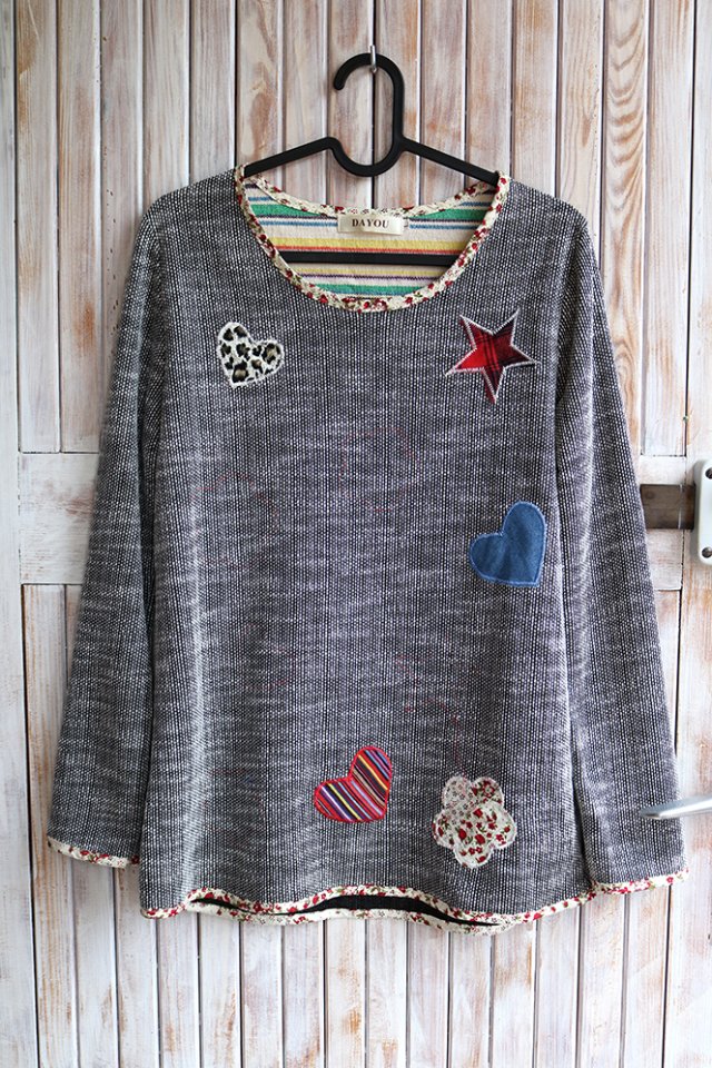 Ciekawa bluzka dzianinowa wykończona kwiatowymi lamówkami i kolorowymi aplikacjami.