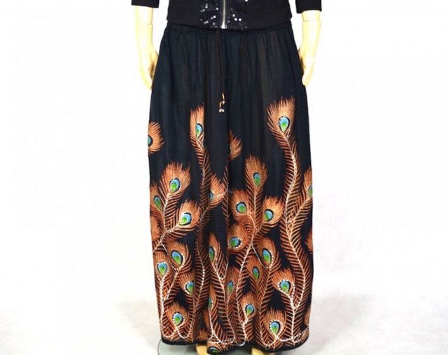 Przepiękna indyjska spódnica w wersji maxi w wyraźne wzory: pawie oka dodatkowo zdobione cekinami. Spódnica o monco rozkloszowanym kroju, w pasie na gumce na sznurku wykończonym dzwoneczkami.