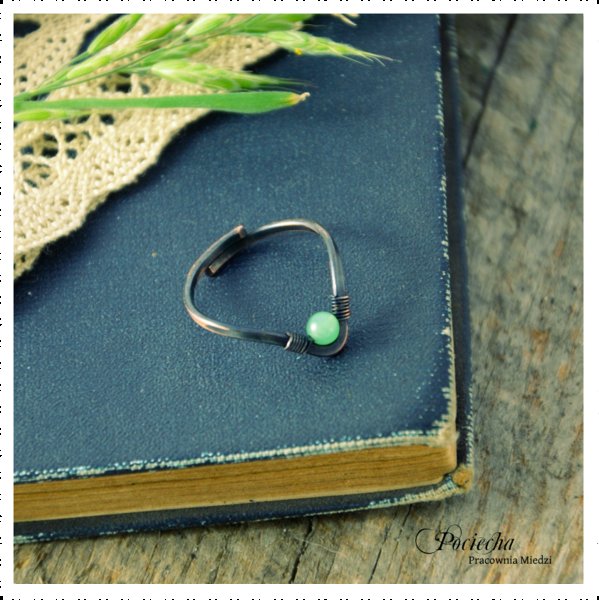 Uroczy pierścionek z miedzi i kulki jadeitu . Koralik ma średnicę 3 mm. Pierścionek ma rozmiar uniwersalny. Można go dopasować do każdego rozmiaru. Pierścionek został spatynowany na antyczny kolor i wypolerowany.