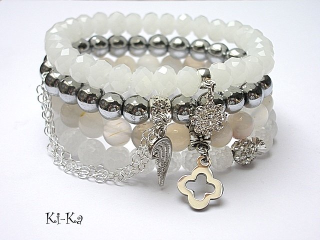 Komplet czterech bransoletek wykonanych z naturalnych kamieni: kryształ lodowy [8mm] ,hematyty [8mm], agaty botswana [8mm],kryształków [6 x 8mm], kulki shamballa wysadzanej kryształkami Swarovskiego [8mm], przywieszki posrebrzanej w kształcie kwiatuszka wysadzanej kryształkami Swarovskiego, przywieszki ze stali szlachetnej, przekładki wysadzanej cyrkoniami oraz elementów metalowych w kolorze srebrnym. Bransoletki pasują na nadgarstek 15 - 16,5cm. Biżuteria ozdobnie zapakowana. Identyczny model został wykorzystany w teledysku Jeremiego Sikorskiego do piosenki Bez niej nie byłoby nas