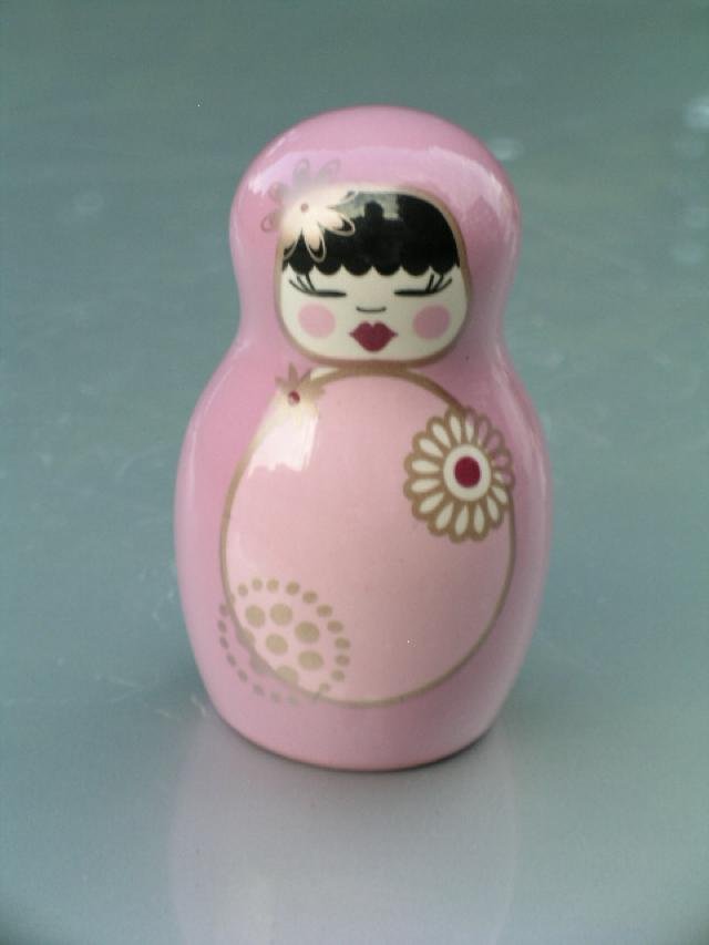Ciekawa, większa, szlachetnie porcelanowa figurka - kształt matrioszki, ale estetyka i uroda zdecydowanie nie-oczywiście rosyjska - może inuicka ? Na błyszcząco szkliwiona, w super kolorze :)