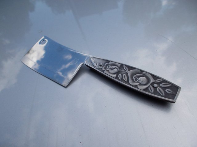 Wielce ciekawy i nie spotykany Niewielki TASAK do Ziół. Bardzo oryginalnie zdobiony. Rączka z jednej strony - przestrzenne, patynowane róże,a z drugiej egzotyczne, proste nitowane drewno. Sygnowany STAILNESS STEEL JAPAN. Z dziurką do powieszenia - dla wygody i ozdoby. Nie jest ostry.