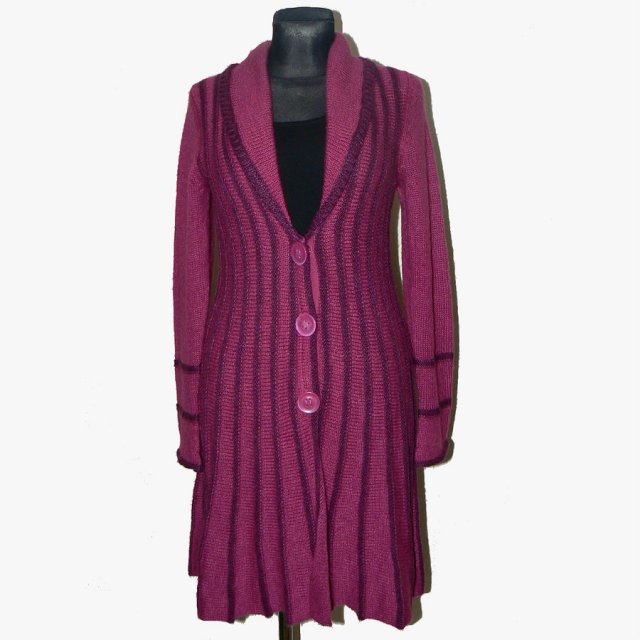 Sweter duńskiej marki Intown. Piękny buraczkowy kolor. Długi, od pasa lekko rozkloszowany, zapinany na metalowe zatrzaski (guziki z zewnątrz doszyte jako ozdoba).