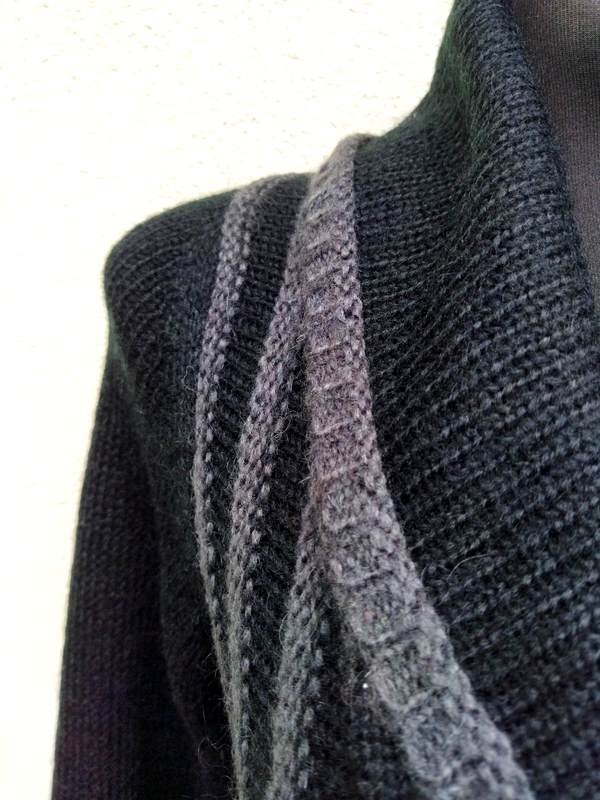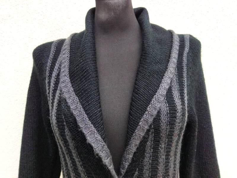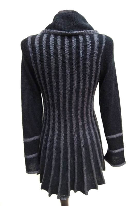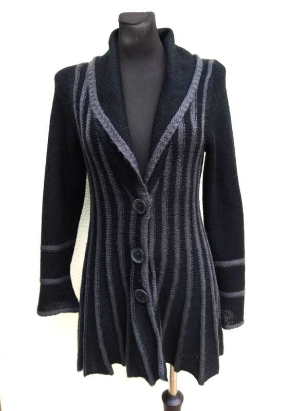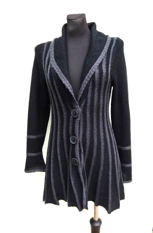 Dłuższy , dobrej jakości sweter w kolorystyce czerni i szarości. Taliowany , z szalowym kołnierzem , rozkloszowany dołem . Zapinany od wewnątrz na trzy mocne metalowe zatrzaski ukryte pod naszywanymi ozdobnymi guzikami. Miły , mieciutki i bardzo lekki
