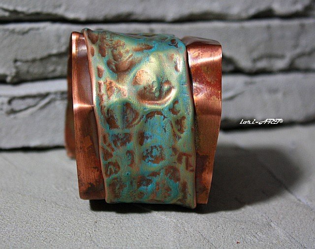 Intrygująca efektowna bransoleta wykonana ręcznie techniką fold forming , surowe klimaty , wykonana z kutej , formowanej , repusowanej miedzi , środek patynowany profesjonalnym , specjalistycznym woskiem w tonacji turkusu , akwamaryny, złota , bransoleta jest plastyczna - można dowolnie układać ją sobie na nadgarstku jeśli chodzi o szerokość i formę , dł. całkowita - ok. 21 cm , szer. w najszerszym miejscu - ok. 6 cm w najwęższym - ok. - 4 cm , bransoleta jest dosyć masywna , ciężkawa , czuć ją na ręce - propozycja dla pań , które preferują tego typu biżuterię . Zabezpieczona odpowiednim medium przed wpływem czynników zewnętrznych . Biżuteria zostanie bezpiecznie , ozdobnie zapakowana .