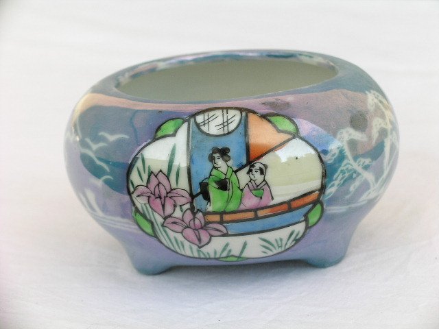 Porcelanowa otwarta cukiernica w ciekawym, miękkim kształcie i uroczymi stópkami. Ręcznie malowana i pokryta perłowo połyskującym szkliwem w niespotykanym kolorze. Lekka, szlachetna, oryginalna. Pękatość 9; otwór 6; wysokość 5,5 cm. Stan zachowania bardzo dobry.