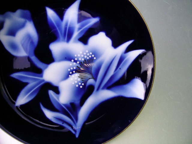Intrygujący Porcelanowy Talerzyk...niesamowite zdobienie na głebokim na błyszcząco szkliwionym kobalcie...Bardzo malarskie. No i w wielce wyrafinowany sposób złotem okraszone :) Tylko pręciki kwiatu o rant są złocone.