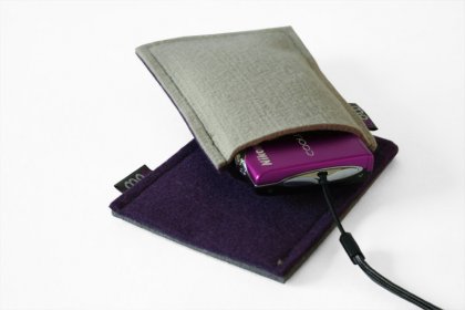 Etui na komórkę lub aparat fotograficzny wykonane z wysokiej jakości włoskiego filcu we fioletowo - szarym kolorze. Wymiary:szerokość 8,5 cm, wysokość 13 cm. Pasuje do iphona oraz większość smartfonów