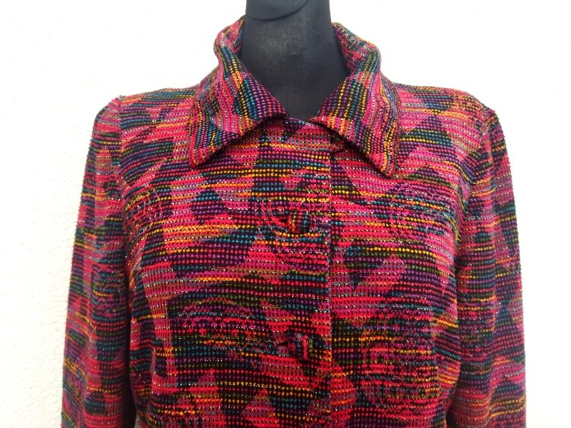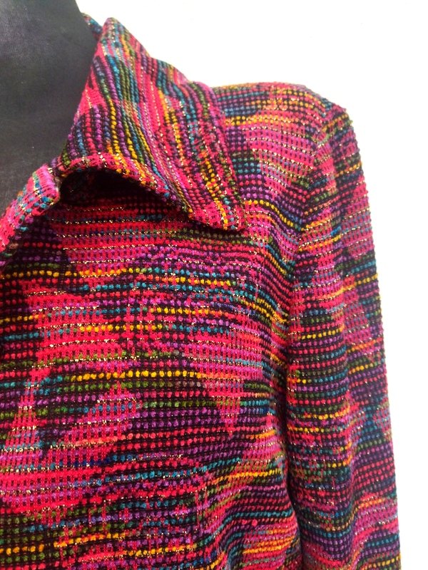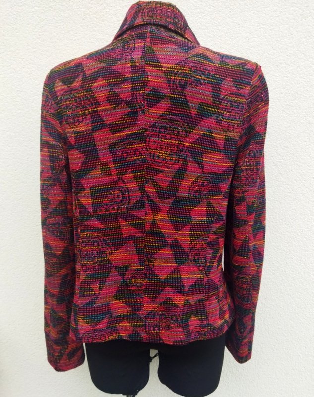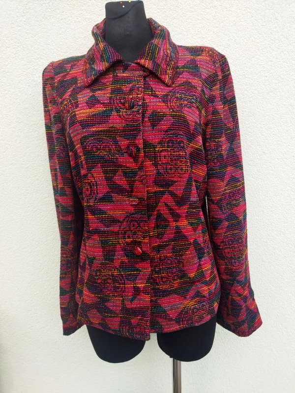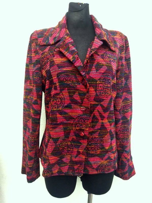 Żakardowa wzorzysta marynarka z dzianinowej tkaniny z lekko szenilową fakturą w kolorystyce czerwieni , zieleni, fioletu, błękitu i żółci , przetykana metaliczną złotą nitka. Z kołnierzem , zapinana na oblekane tkanina guziki. Całość na podszewce. Ładniejsza w realu