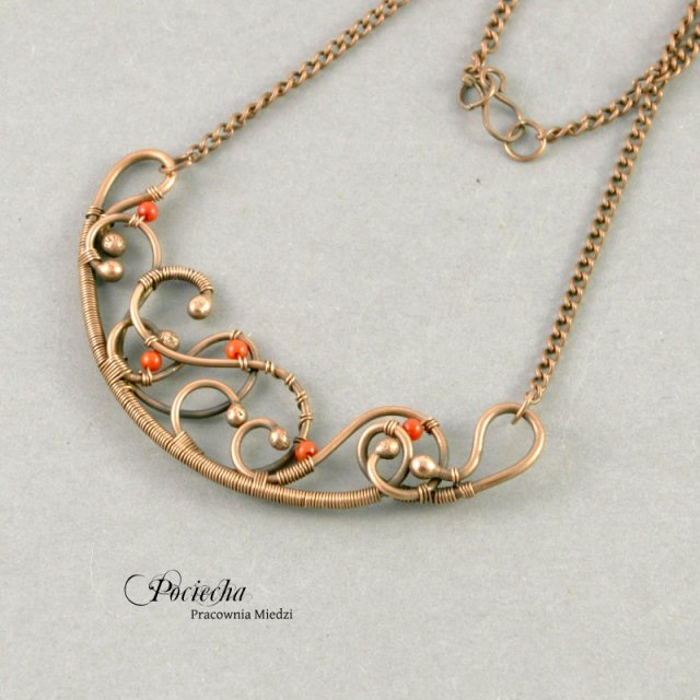 Delikatny naszyjnik w secesyjnym stylu. Element ozdobny misternie wypleciony z miedzi jubilerskiej. Ozdobnego akcentu dodają maleńkie kuleczki korala czerwonego.