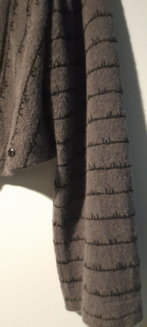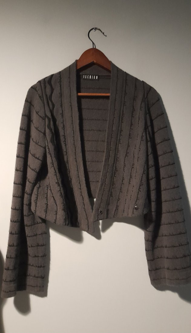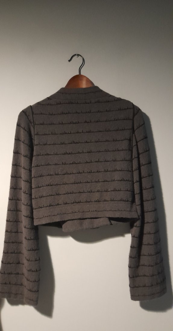Krótki lekki sweter z rozszerzanym rękawem, mięsista, lekko szorstka dzianina, mieszanka, 55 % wełna, zapinana na dwie zatrzaski i w takiej wersji rozmiar 36/38, bez zapinana świetna narzutka do rozmiaru 42/44, szaro czarny, stan idealny, jedynie zatrzaski mogą wymagać przeszycia, długość zapiętej 46, szerokość 50, bez zapinania przody dłuższe