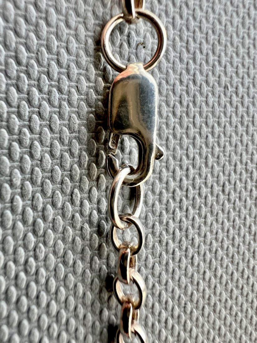 Świetny projekt o wysokim nowoczesnym wyrazie artystycznym, w stanie idealnym, bez uszkodzeń itp. Łańcuch srebrny mocny, wszystkie elementy bez uszkodzeń.