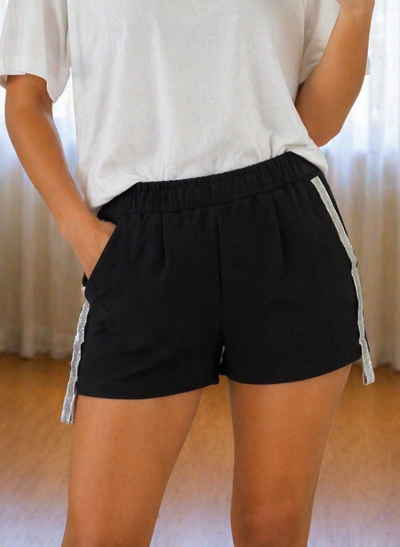 Włoskie krótkie czarne spodenki ze srebrnym lampasem.