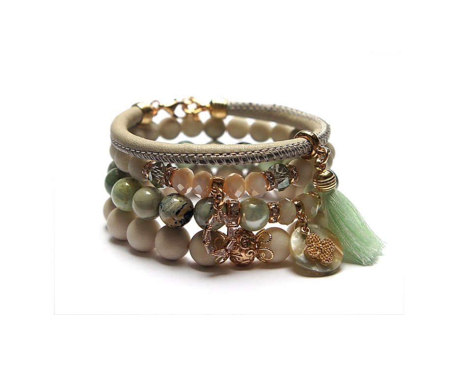 Komplet czterech bransoletek wykonanych z naturalnych kamieni - jadeity [8 i 10mm], opalit [8mm], jaspis matowy [8mmi 10mm], jaspis [10mm], pereł majorka [10mm], kryształków fasetowanych [8mm], rzemienia z naturalnej skóry, chwostu, zawieszki z żywicy, zawieszki wysadzanej cyrkoniami oraz elementów metalowych w kolorze złotym. Bransoletki pasują na nadgarstek 16-17cm.