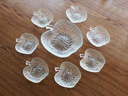 szklany komplet składający się z jednej większej misy i 7 salaterek. Ciekawy oryginalny wzór połówek jabłek. Powierzchnia na zewnątrz o chropowatym wzorze. Stan- rzecz używana w stanie bardzo dobry. Zestaw jest śliczny i bardzo urokliwy -zdjęcia niestety nie oddają rzeczywistego uroku kompletu