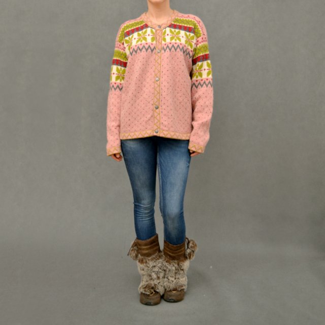 Śliczny sweterek w norweski wzór w ciekawej odsłonie kolorystycznej. W większości różowy z dodatkiem oliwki, szarości, bieli i czerwieni. Zapinany na ozdobne guziki. W całości z wełny szetlandzkiej.