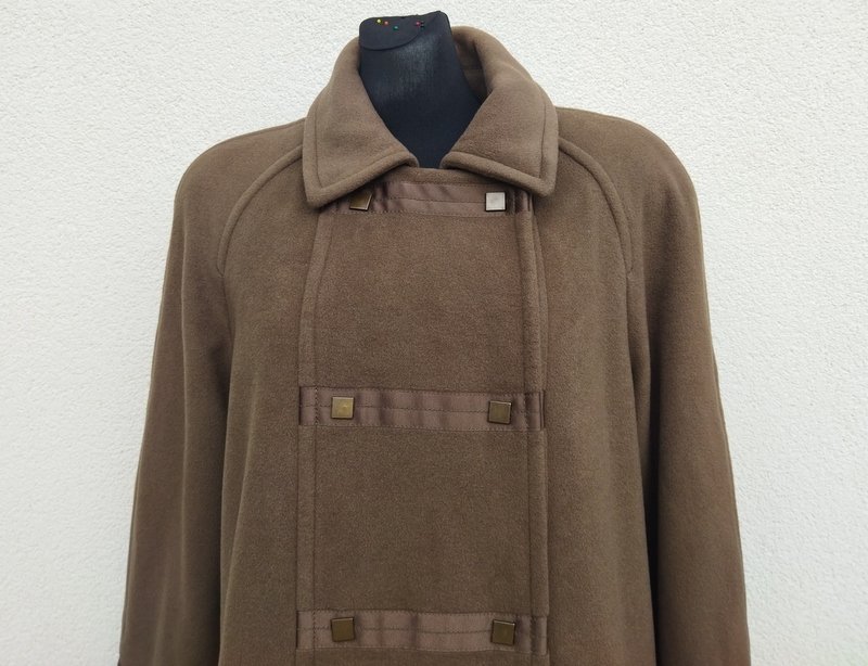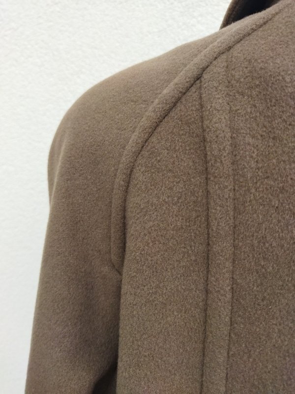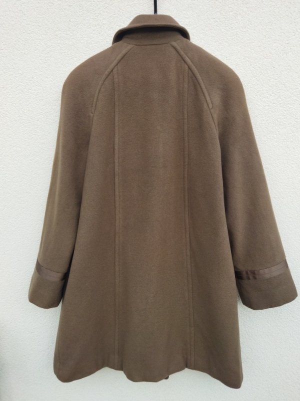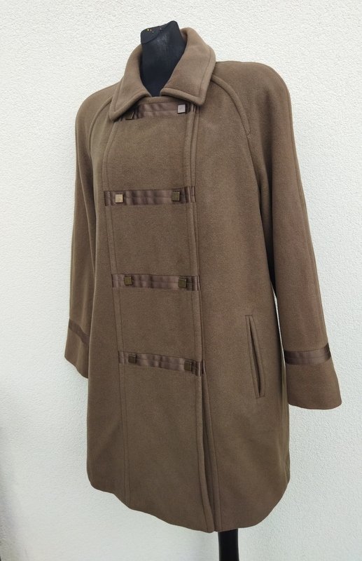 Wysokogatunkowy płaszcz z wełnianej tkaniny z dodatkiem poliamidu, w kolorze kiwi, z naszywanymi rypsowymi taśmami w kolorze tkaniny. Z kołnierzem, rękawy raglanowe , dwie wpuszczane kieszenie. Zapinany na napy . Całość na podszewce. Dużo ładniejszy w realu.