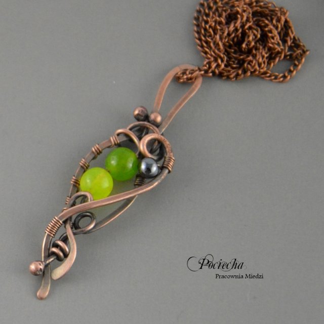Naszyjnik składa się z wisiorka i łańcuszka. Wisiorek od podstaw stworzony ręcznie z miedzi, centrum wisiora stanowią dwie kule jadeitu o średnicy 6 mm oraz kuleczka hematytu 4 mm. Liczne sploty czynią wisiorek wyjątkowym.
