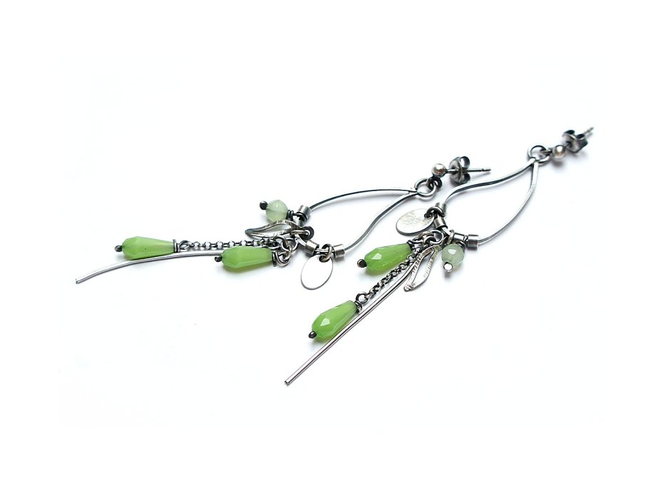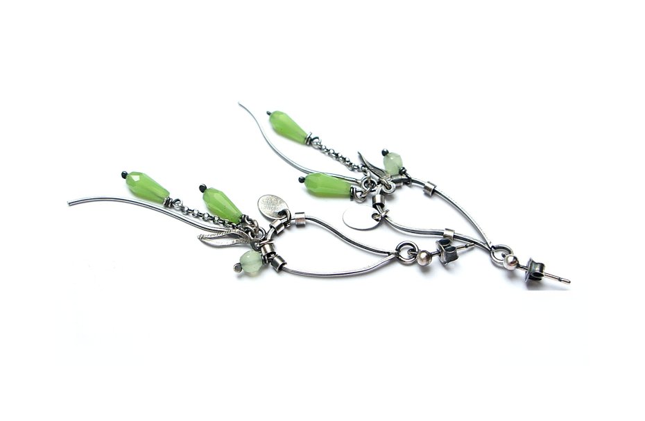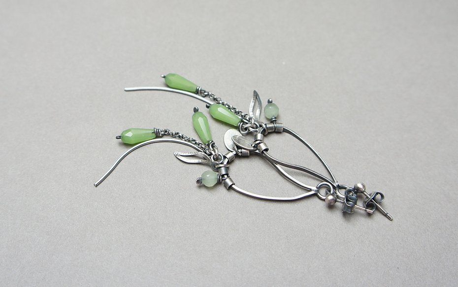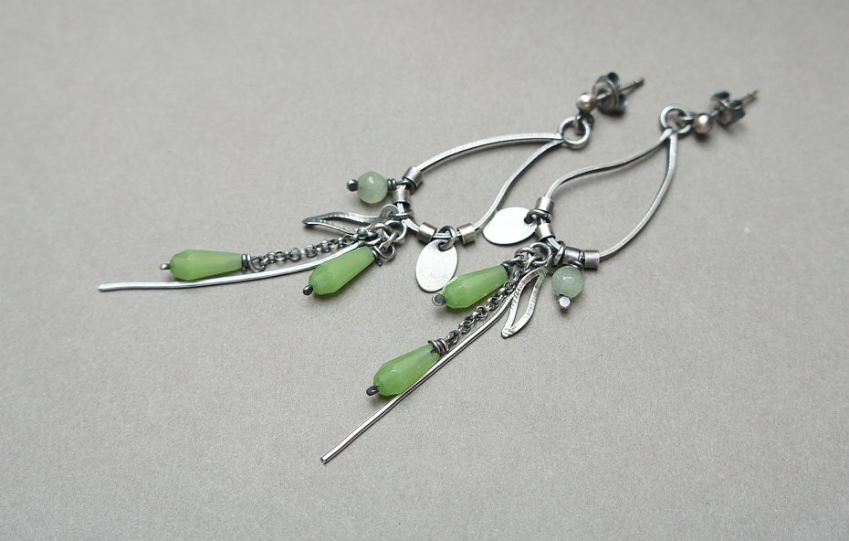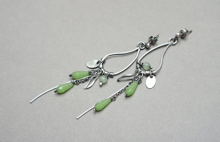 Kolczyki wykonane ze srebra [pr. 925] w połączeniu z fasetowanymi kuleczkami jadeitów [4mm] ,kropelkami kryształków [10mm]. Srebro oksydowane i przetarte. Całkowita długość kolczyków około 8cm. Biżuteria ozdobnie zapakowana.