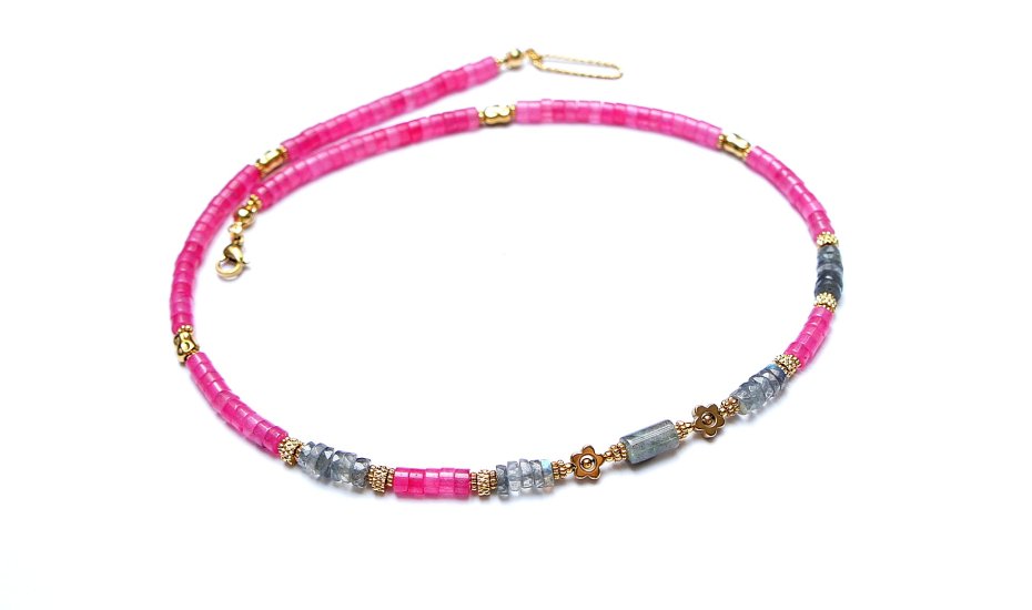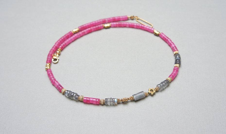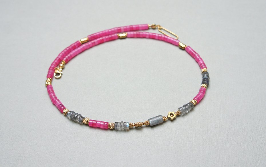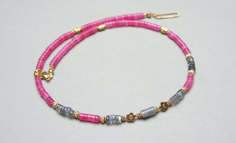 Krótki naszyjnik wykonany w całości z pozłacanej stali szlachetnej oraz minerałów - nieregularne talarki labradorytów [4 x 2mm; kamienie wysokiej jakości, każdy labradoryt o wysokiej labradoryzacji], talarki jadeitu [4 x 2mm], wałeczka labradorytu [12mm], kwiatków z hematytu [6mm]. Naszyjnik o długości ok. 45cm.