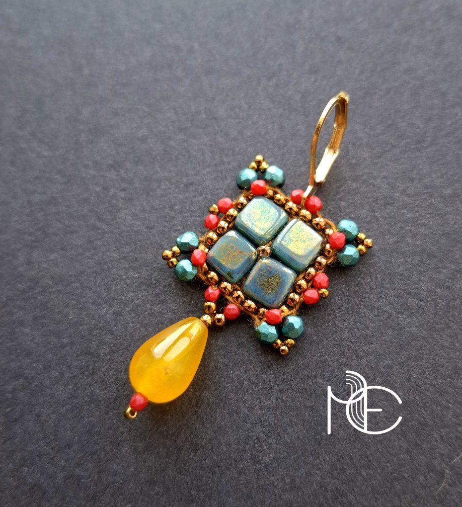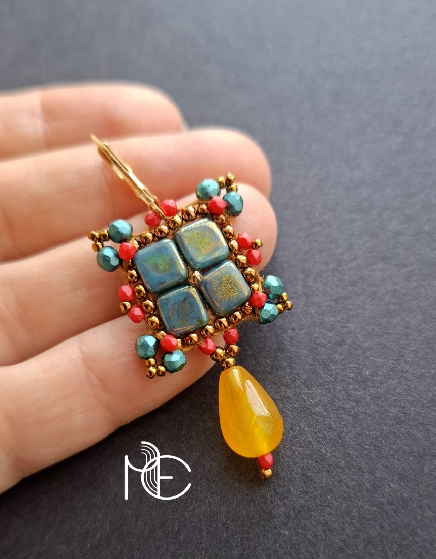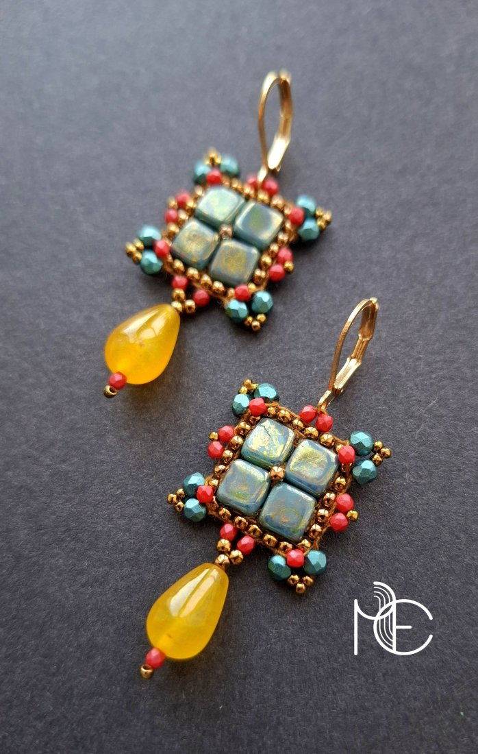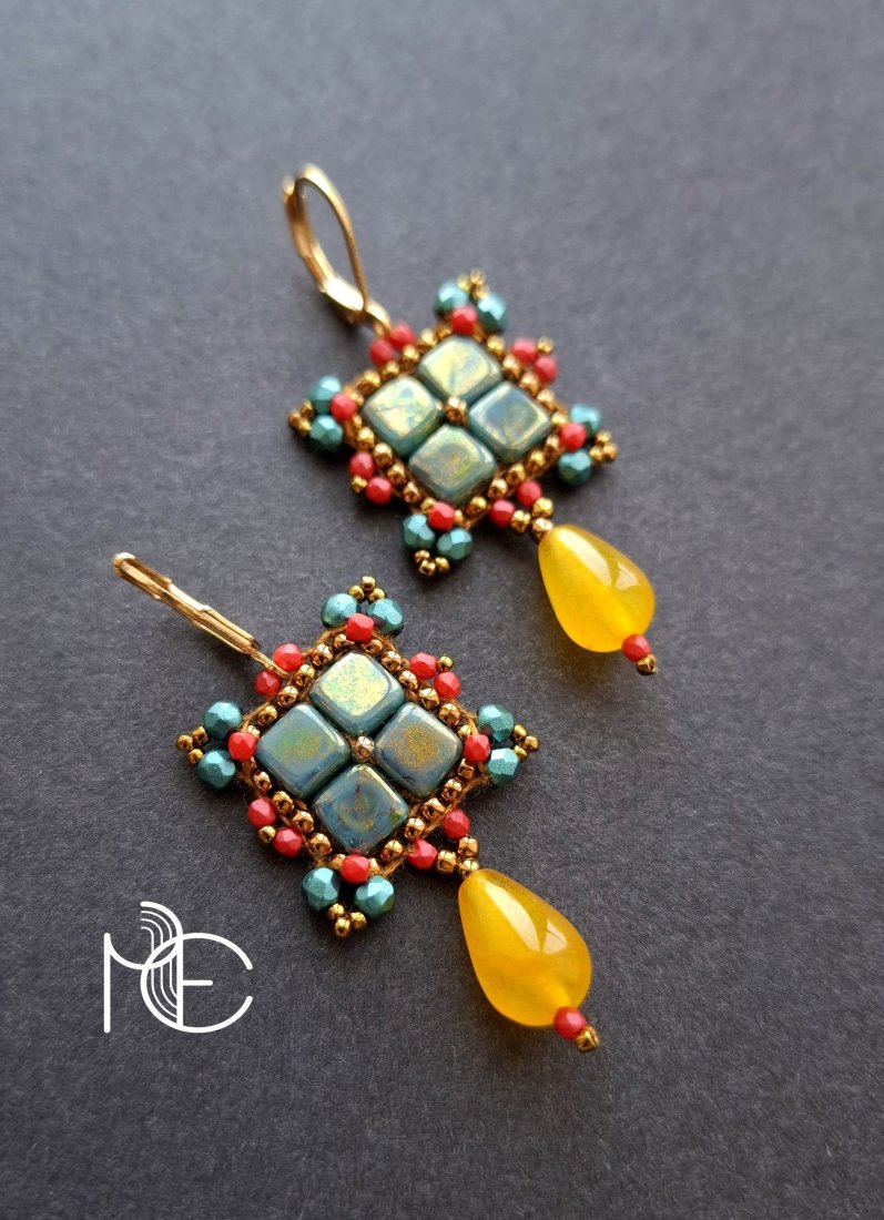 Kolczyki wiszące, wykonane techniką swoistego haftu drobnymi, szklanymi koralikami w połączeniu z żółtymi kroplami jadeitu. Dwustronne, podwieszone na pozłacanych i nieuczulających biglach typy angielskiego. Wymiary - długość wraz z zapięciem: 5,5 cm, szerokość max. 2,2 mm. Wykonane w jedynym egzemplarzu.
