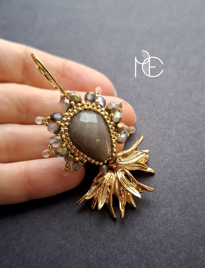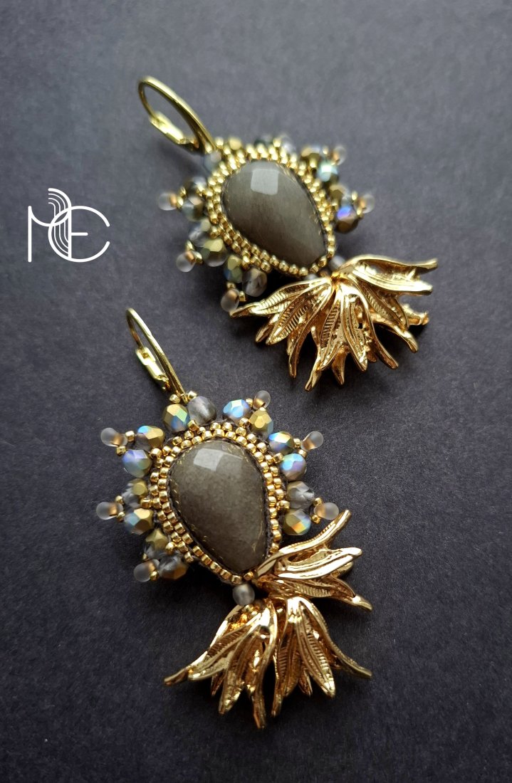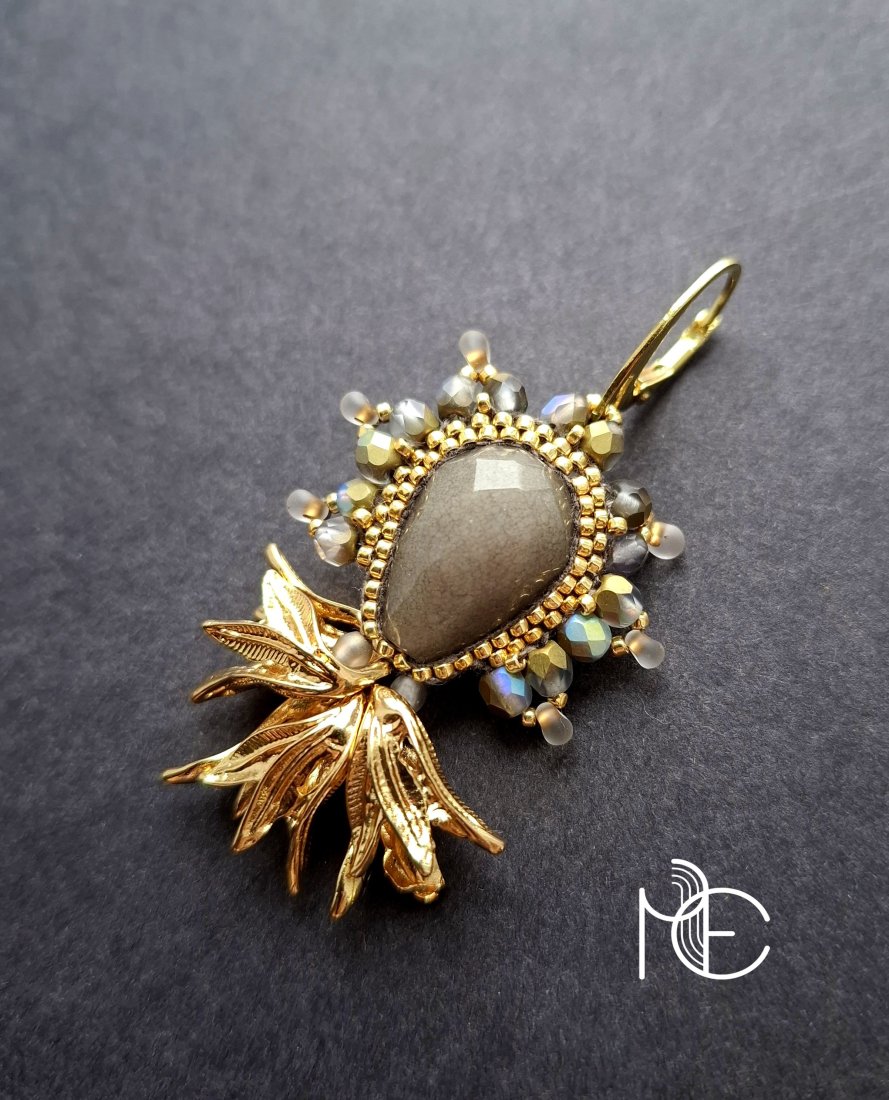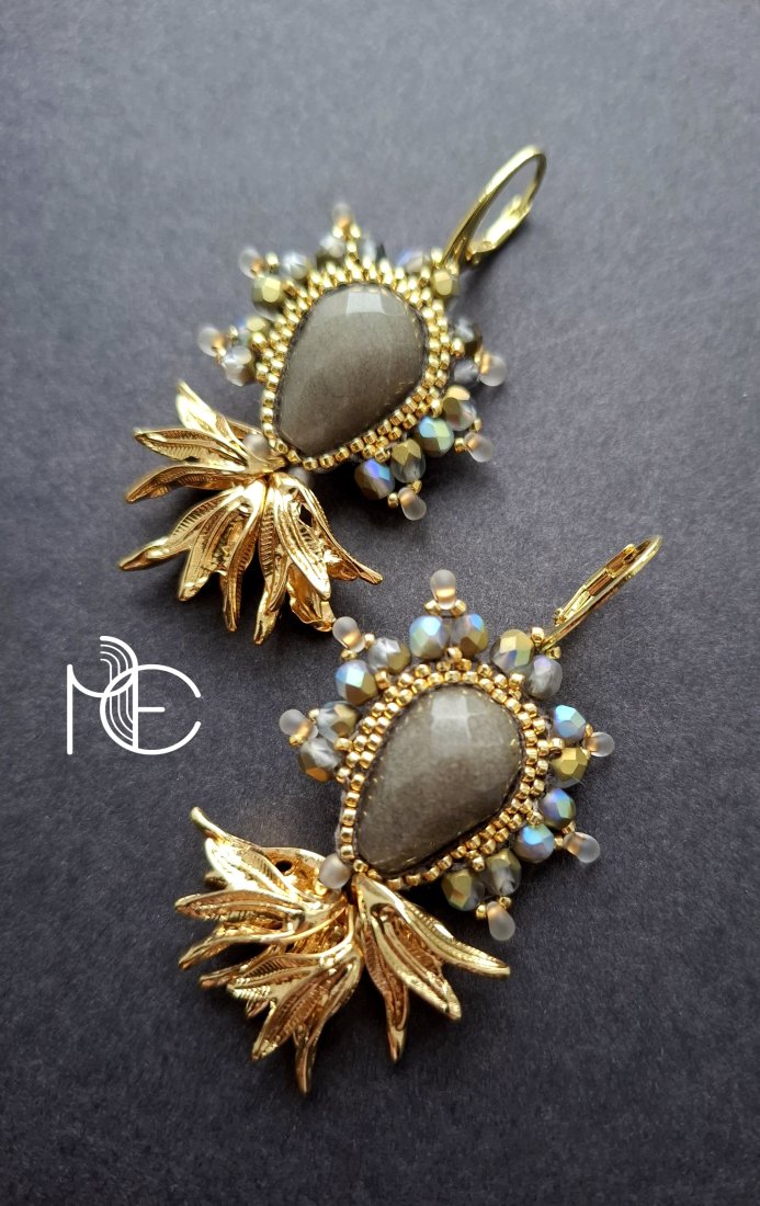 Efektowne kolczyki wiszące wykonane swoistą techniką haftu drobnymi, szklanymi koralikami w połączeniu z szarymi, szlifowanymi jadeitami oraz ozdobnymi elementami metalowymi. Dwustronne, podwieszone na pozłacanych, nieuczulających biglach typu angielskiego. Wymiary: długość wraz z zapięciem: 6,3 cm; szerokość max. 3,5 cm. Wykonane w jedynym egzemplarzu.