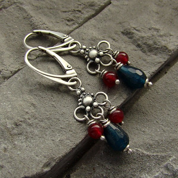 Urocze, kobiece kolczyki na co dzień i nie tylko w soczystych kolorach. Wykonane w całości z oksydowanego srebra próby 925 oraz kropli morskiego jadeitu wielkości 0,9 cm oraz kulek jadeitu w wiśniowym kolorze wielkości 4 mm . Całkowita długość kolczyków to ok. 4,4 cm. Ozdobnie zapakowane.