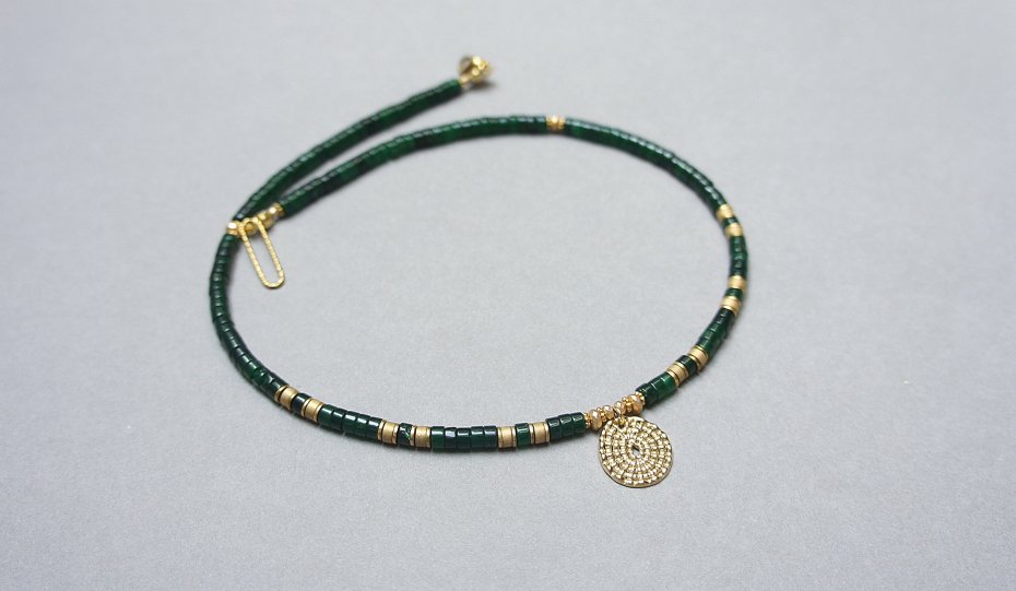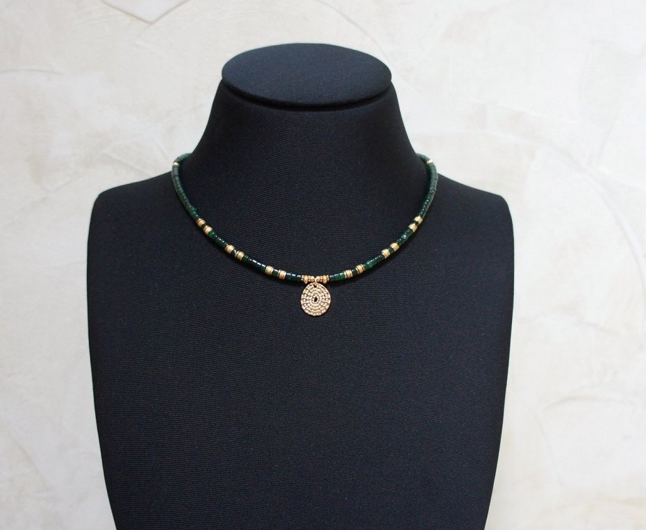 Krótki naszyjnik wykonany w całości z pozłacanej stali szlachetnej oraz naturalnych kamieni - talarki jadeitu w kolorze butelkowej zielieni [4 x 2mm], talarki matowego hematytu [4 x 2mm], oponki platerowanego, fasetowanego hematytu [ 3 x 2mm i 2 x 1mm] Naszyjnik o długości ok. 43cm.