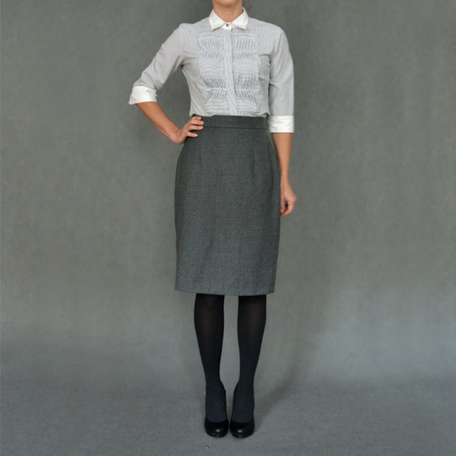 Piękna, szara, ołówkowa spódniczka marki JAEGER. Na podszewce, z tyłu zapinana na zameczek i guziczek. Klasyka w miękkiej wełnie i szarości. Ponadczasowa. Polecam.
