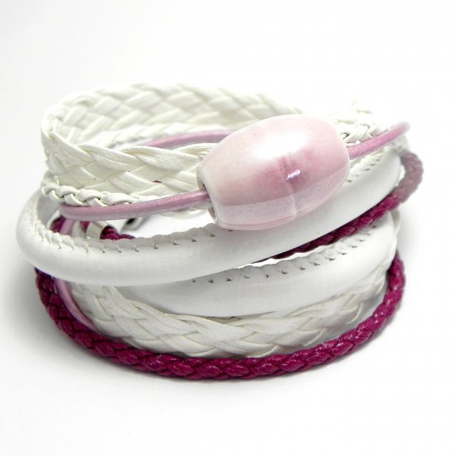 Elegancka bransoletka wykonana tylko w JEDNYM EGZEMPLARZU, z różnorodnych rzemieni ze skóry naturalnej i ekologicznej, ceramicznego korala oraz elementów w kolorze srebrnym. Bransoletka będzie pasowała na nadgarstek 15-17 cm, podwójnie oplatana.
