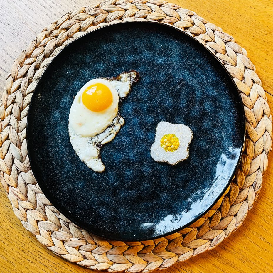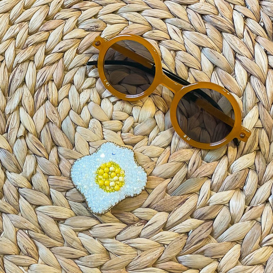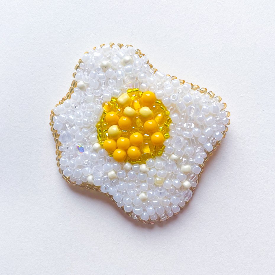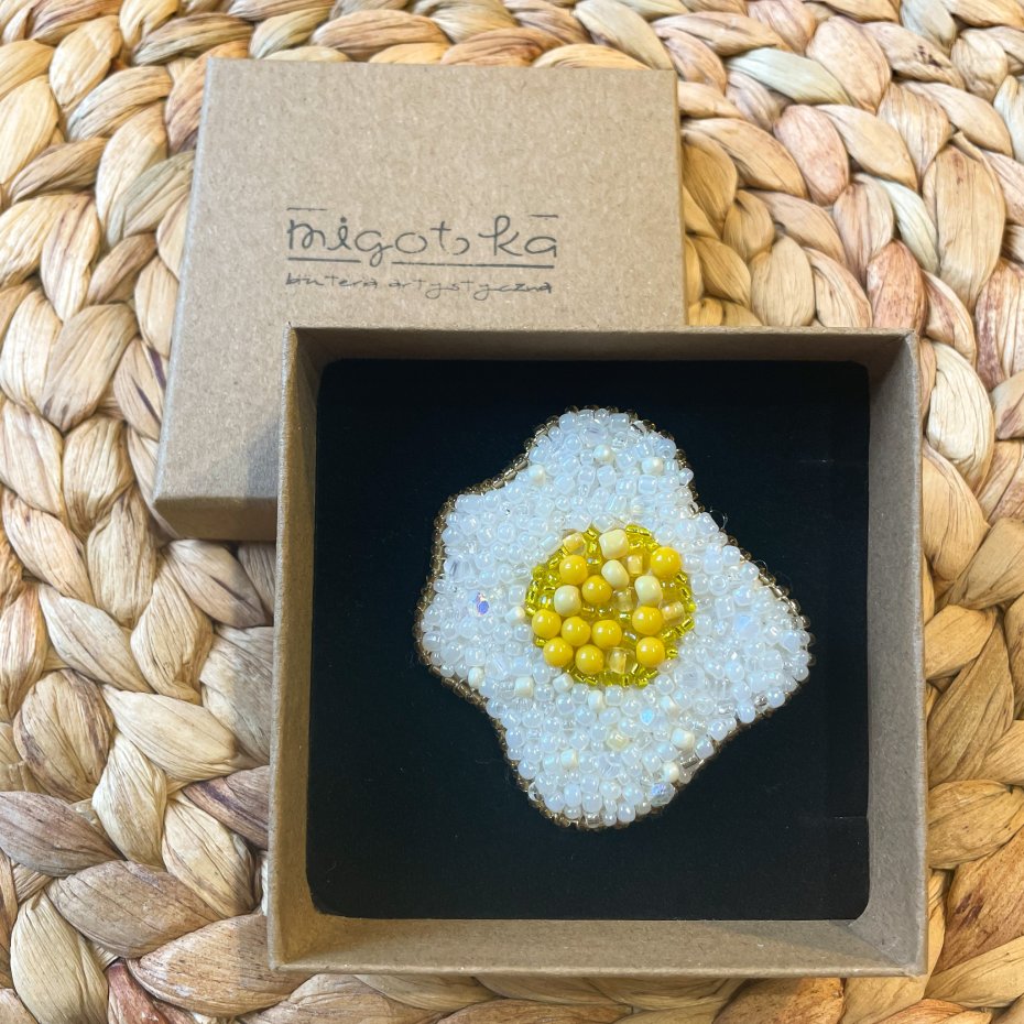 Unikatowa broszka w kształcie jajka sadzonego, wykonana ręcznie techniką haftu koralikowego. Zabawna, minimalistyczna i jednocześnie artystyczna – idealna dla osób z poczuciem humoru, miłośników designu i oryginalnych dodatków.