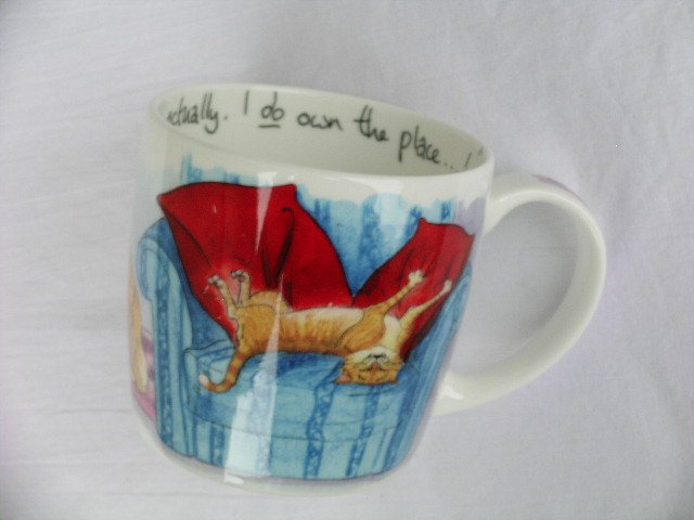 Fantastycznym dowcipnym obrazkiem zdobny wygodny kubek porcelanowy, szlachetny, sygnowany Hudson Middleton, z ilustracją autorstwa Alison Lingley. Co kot wyczynia na totalnym luzie - na to trójka psów patrzeć ledwie może... :) Ha ha ! Kubek wygodny, duży, jakościowy, z błyszczącym szkliwieniem. Dół 7; szer. 11; wys. 8,2 cm. Stan zachowania bardzo dobry. Świetny na codzienny uśmiech i pyszną kawo-herbatę :) Świetny na oryginalny i niespotykany prezent ;)