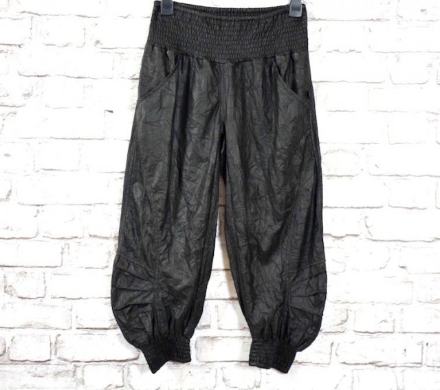 Fajne, luźne czarne spodnie typu pumpy wykonane z fabrycznie pomiętej tkaniny z wyglądu przypominającej z cięnką skórę, w pasie na szerszej gumie, nogawki luźne wykończone ściągaczem, po bokach kieszonki i małe logo marki.Rozmiar jaki widnieje na metce to S, jednak w rzeczywistości wypadają bardziej na M/L.