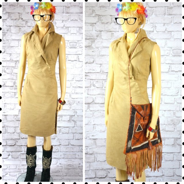 Świetna sukienka w kolorze ciemniejszego beżu wykonana z tkaniny w dotyku i z wyglądu imitującej zamsz, góra z większym kołnierzem , po bokach zaszewki oraz z jednej strony suwak- w pasie dopasowana, poniżej luźniejsza, u dołu po bokach krótkie rozcięcia.