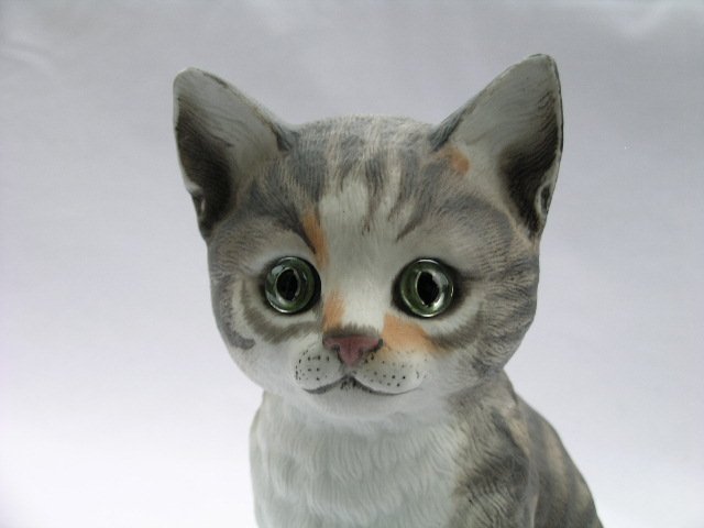 Bardzo duża, szlachetnie lekka porcelanowa figura kociej obecności - niezwykle efektowna przez swój rozmiar. Z precyzją wykonana, lekko fakturowa sierść, ręcznie malowana... no i te oczy, z masy błyszczącej, z głębią i połyskiem, zielone, świecące, żywo patrzące :) Ach ! i jeszcze ta uniesiona z wdziękiem lewa łapka ! Uwaga - wymiary: 13 x 10 x 17 cm. Sygnatura Danbury Mint, seria kolekcjonerska, inspektorowana :) Stan zachowania bardzo dobry. Do kolekcji i na doskonały prezent dla miłośnika kotów.