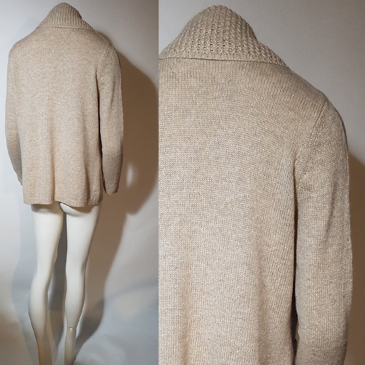 Sweter z kołnierzem szalowym z bardzo przyjemnej, miękkiej dzianiny o świetnym składzie. Z przodu kieszenie nakładane, rękawy długie, dopasowane. Możliwość zapięcia na zatrzaski lub noszenia luzem.