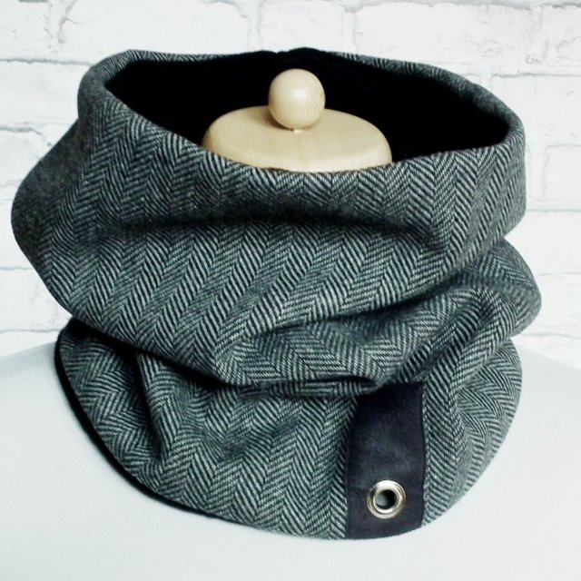 Elegancki, uniwersalny, modny, niezwykle praktyczny i ciepły dodatek. Dwustronny komin uszyty z doskonałej włoskiej tkaniny wełnianej w jodełkę oraz miłej dla skóry dzianiny o wyglądzie wełny w kolorze czarnym. Tkanina wewnętrzna czarna jest bardzo przyjazna dla skóry, miła w dotyku i puszysta. Szal na dole posiada ozdobną naszywkę z imitacji zamszu z metalowym nitem.