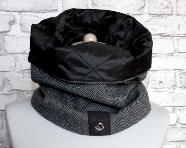 Elegancki, uniwersalny, modny, niezwykle praktyczny i ciepły dodatek. Dwustronny komin uszyty z doskonałej włoskiej tkaniny wełnianej w jodełkę oraz pikówki w kolorze czarnym. Szal na dole posiada ozdobną naszywkę z imitacji zamszu z metalowym nitem.