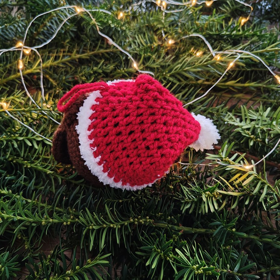 Wykonana z miękkiej włóczki i ubrana w świąteczną czerwoną czapkę Mikołaja ozdoba wniesie ciepło, charakter i świąteczną atmosferę do Twojego wnętrza lub zaskoczy miłośnika psów przemyślanym, ręcznie robionym prezentem, który będzie dla niego pamiątką przez lata.