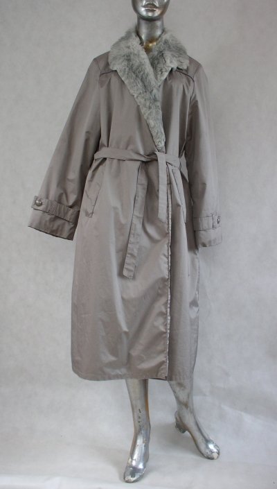 Płaszcz damski firmy Jan Robert.Materiał 73% elastomere+27% polyester.Rozmiar 16,nasz 42-44.Podszewka szara,pikowana z lekkim ocieplaczem.Kołnierz podwójny ,obszyty szarym,sztucznym futerkiem.Przód bez zapięcia,krzyżowany + pasek wiązany.Dwie kieszenie pionowe,chowane do środka.Rękaw długi,prosty w dole paseczek zapięty na ozdobny guzik.Z tyłu na środku kontrafałda.Stan bardzo dobry.Długość 118 cm.ramiona 42 cm.rękaw 63 cm.