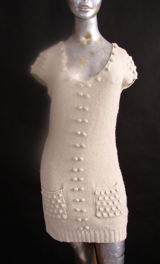 Włóczkowa sukienka firmy jane norman.Rozmiar 40.Włóczka akryl.Dół wykończony ściągaczem.Dekolt okrągły,ozdobiony kulkami.Rękaw krótki,ozdobny.W dole dwie kieszenie,ozdobne.Stan dobry,lekko zmechacona.Długość 87 cm.pod pachami 100 cm.lekko rozciągliwa.