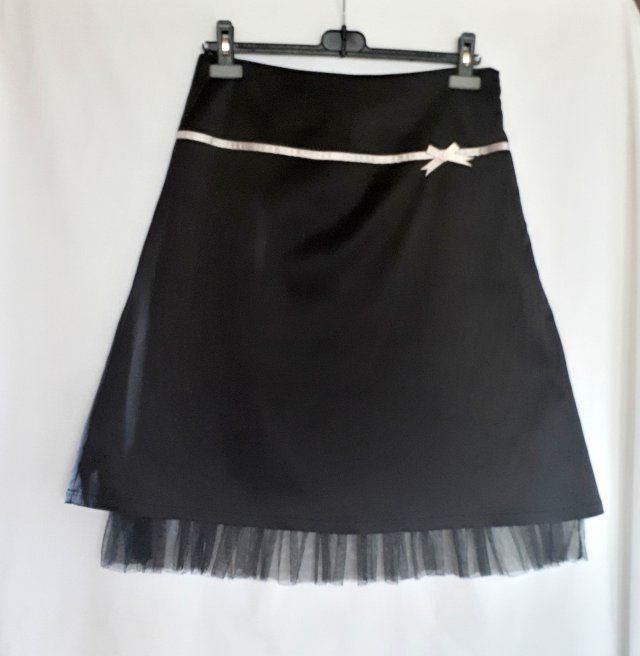 Czarna, satynowa sódnica na małym karczku, u dołu karczku satynowa tasiemka z kokardką, w kolorze złamanej bieli, zapinana z boku na zamek, od spodu czarna podszewka, do niej doszyta szersza tiulowa falbana wystająca spod spódnicy
