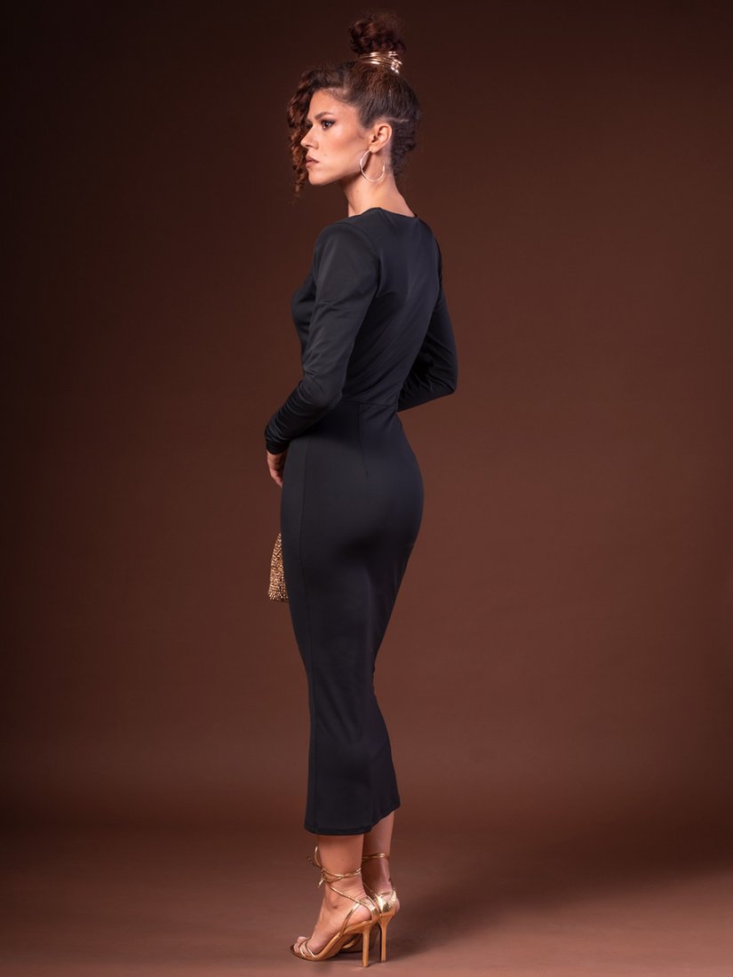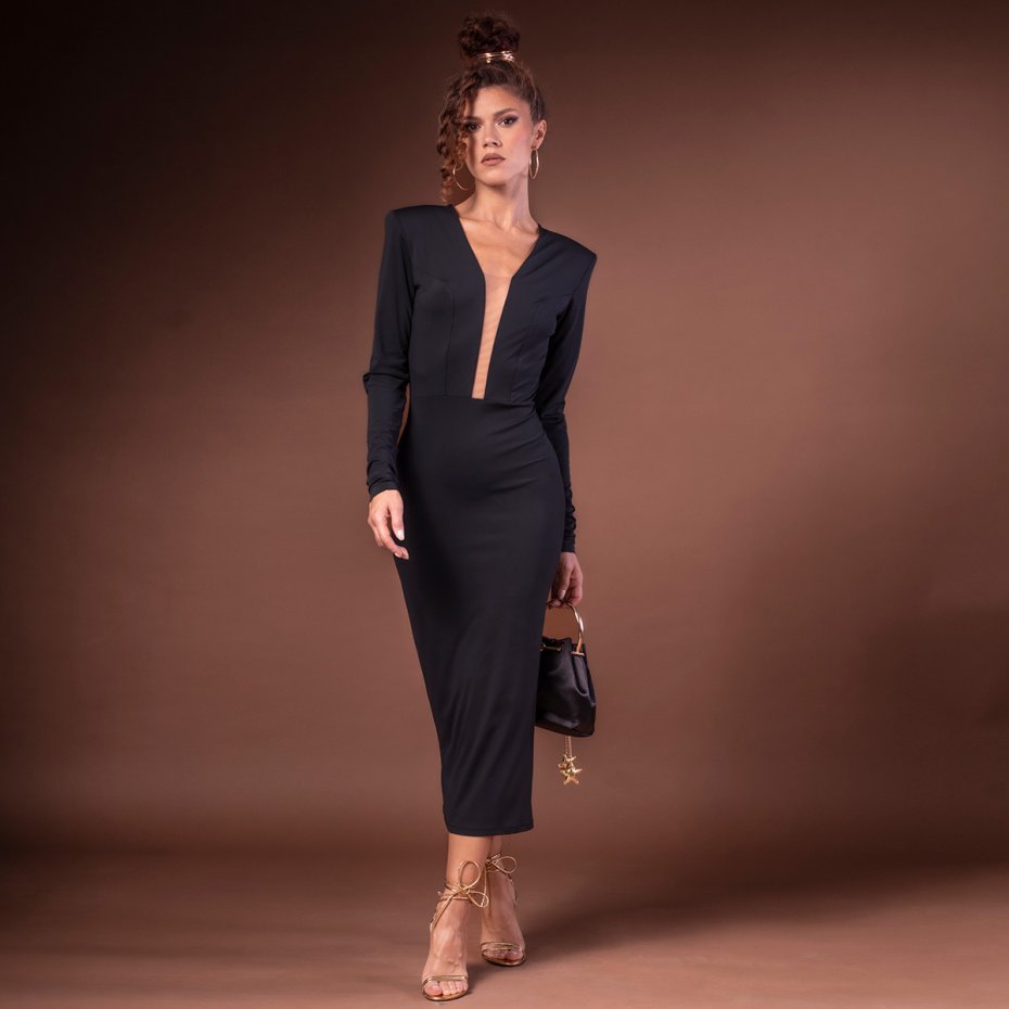 Sukienka jest mocno dopasowana, o długości 7/8 i geometrycznie skonstruowaną linią ramion. Całość uzupełnia bardzo głęboki dekolt, który jest utrzymywany za pomocą siateczki w kolorze skóry. Dostępna jest w kolorze czarnym, z długim rękawem o długości około 50 cm (mierzonym po wewnętrznej stronie) i długości od talii około 82 cm. Dostępne rozmiary: 34-38 (sprawdź naszą tabelę rozmiarów). Po zakupie podaj swój rozmiar.