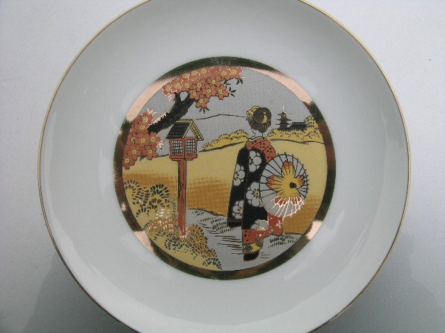 Porcelanowy,nie sygnowany,ale w charakterystycznej stylistyce,zdobieniu i złoceniu - THE ART OF CHOKIN...:Japoński. :) Biel porcelany raczej chłodna,wzór i złocenie dla równowagi...cieplutkie; Z tyłu profesjonalny uchwyt do powieszenia. 16,5 x 1,5