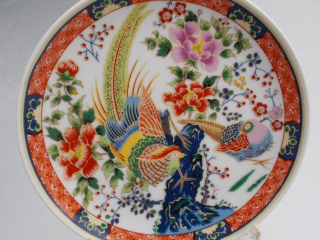 Porcelanowy talerz z bogatym ogrodowo-kwiatowo-ptasim zdobieniem w żywych, radosnych kolorach. Biała porcelana, złocenia. Precyzja nadruku.Zniuansowane barwy.. Niezaprzeczalna uroda motywów zdobniczych; Wzór nieco satynowy na wykończonej na błyszcząco porcelanie.Sygnowany.