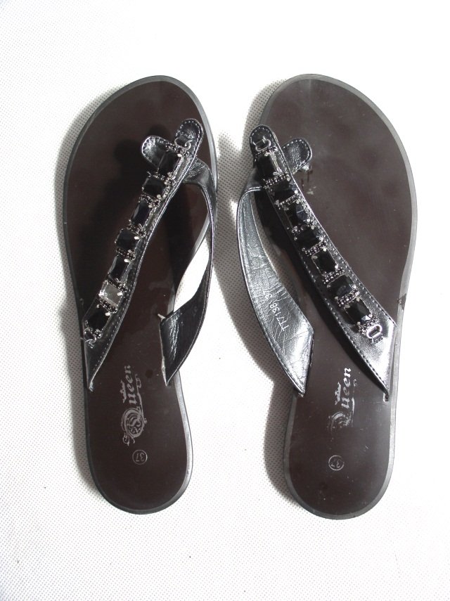 Damskie klapki-japonki,rozmiar 37.Podeszwa syntetyczna z doklejonym płaskim obcasem.Jeden z pasków ozdobiony czarnymi kamykami.Stan bardzo dobry.Długość podeszwy 25 cm.od paska na palce 20 cm.