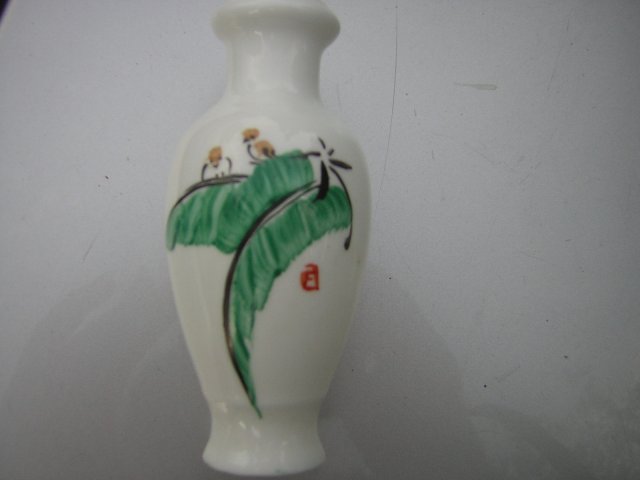 Zachwycająco leciutki wazonik z cienkiej prześwitującej porcelany, ręcznie artystycznie malowany subtelną ikebaną. Sygnowany, czerwonym stemplem. Wzór kwiatowy z jednej strony, z drugiej czysta biel.